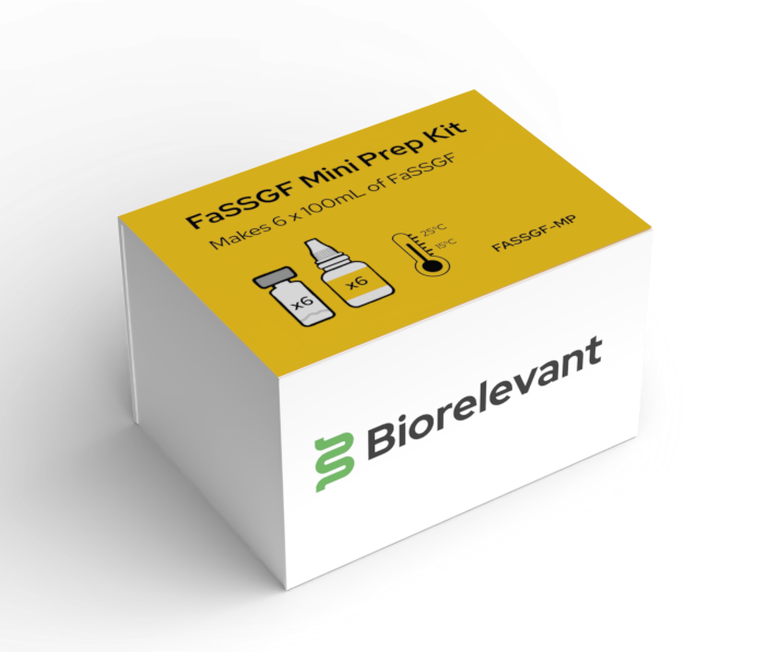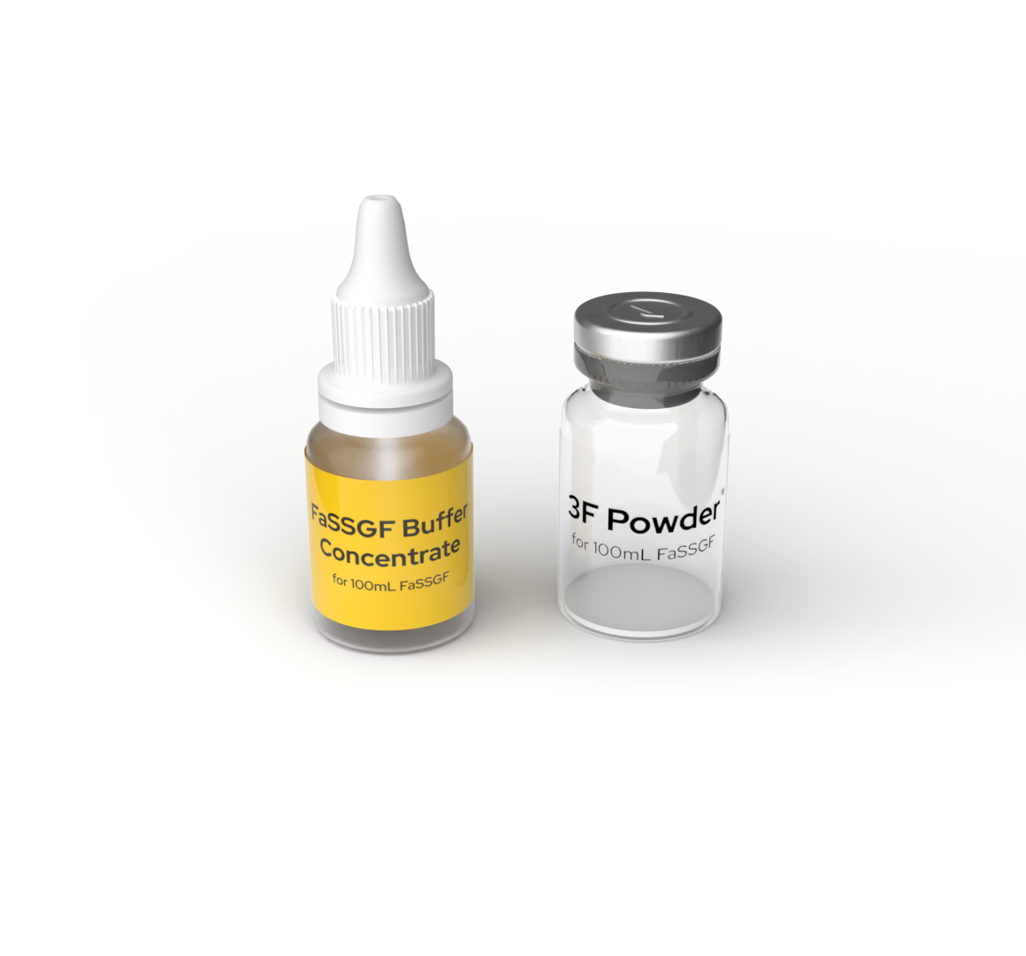 Each kit contains 6 mini bottles of FaSSGF Buffer Concentrate and 6 glass vials of 3F Powder to make 6 x 100mL of medium