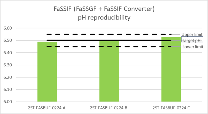 The pH of FaSSIF (prepared by adding FaSSIF Converter to FaSSGF) was measured. All pH’s were measured at room temperature after 48hours of preparing the media. The results are provided below: