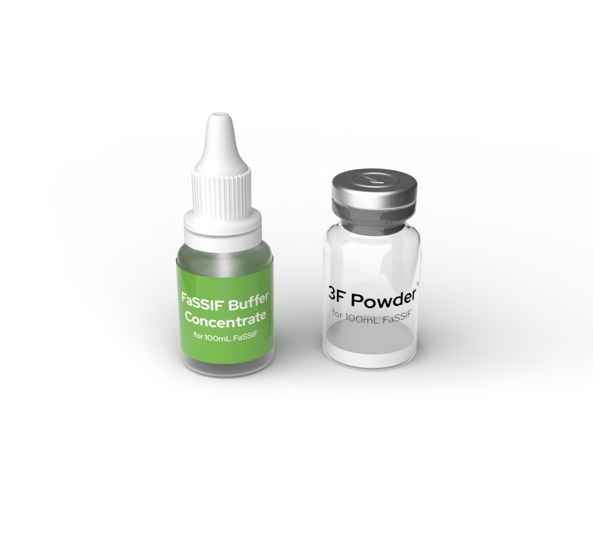 Each kit contains 6 mini bottles of FaSSIF Buffer Concentrate and 6 vials of 3F Powder to make 6 x 100mL of medium